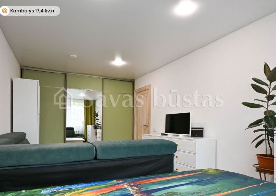 Butas funkcionaliai išplanuotas: svetainė sujungta su virtuve, kambario erdvė - 17,40 kv.m. Įrengimas naujas: pakeisti vamzdynai ir elektros instaliacija, plastikiniai langai su žaliuzėmis, įtempiamos lubos su LED apšvietimu, laminuotos grindys. Virtuvėje - nauji baldai ir įmontuota buitinė technika, miegamojo zonoje - erdvi sieninė spinta. Vonios kambaryje gera ventiliacija ir elektrinis šildytuvas.