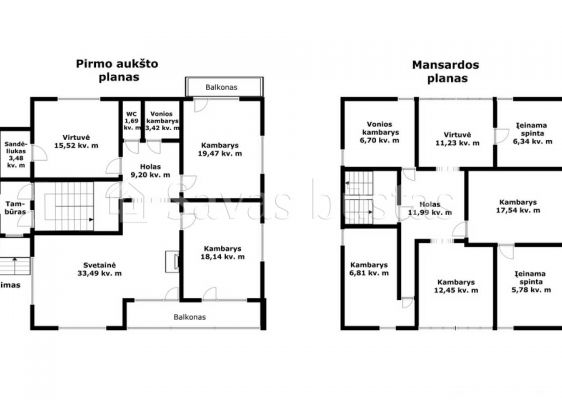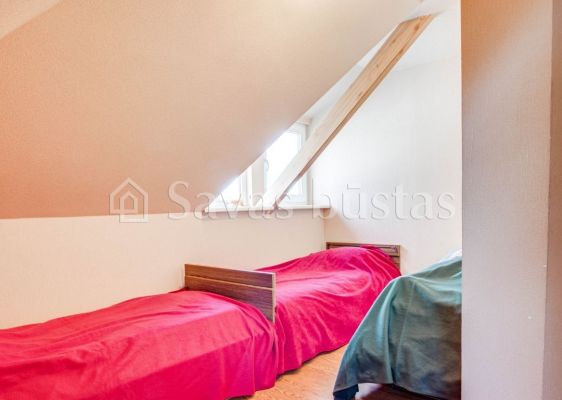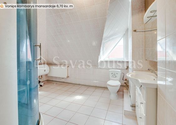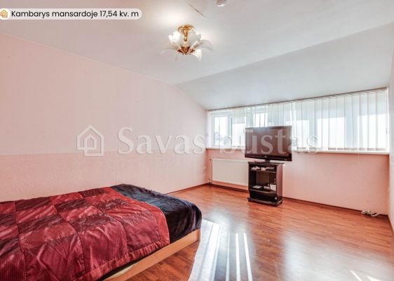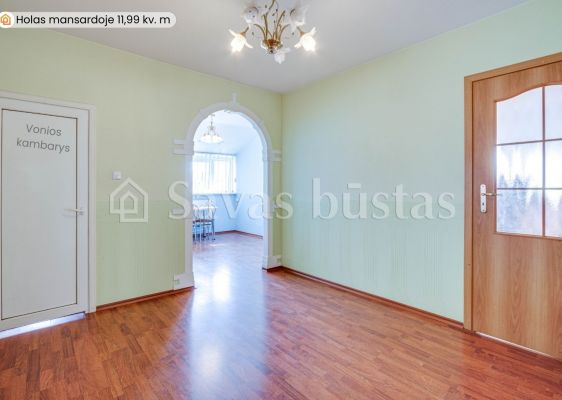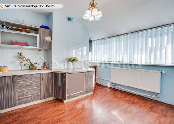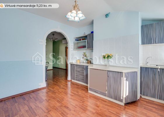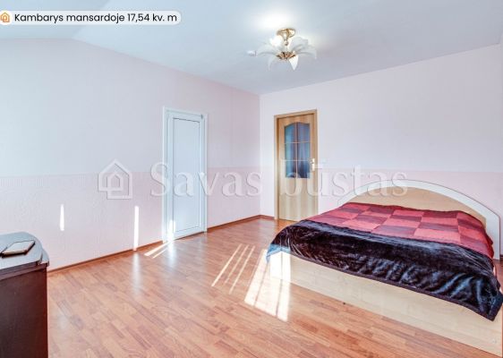 Mansardoje yra erdvus holas, du miegamieji su įeinamomis spintomis, mažas kambarėlis svečiams, virtuvė bei didelis vonios kambarys. Grindys išklotos lamintuota grindų danga. Sienos tapetuotos.