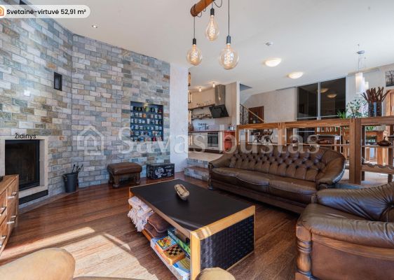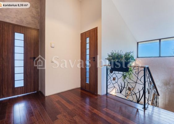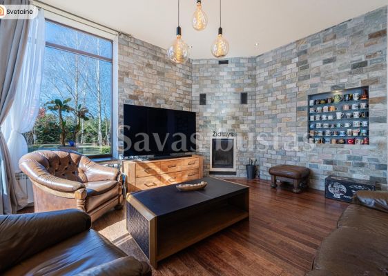 Vidaus įrengimui naudotos ilgaamžės, natūralios medžiagos. Grindų danga - akmens masės plytelės, antrame aukšte medžio masyvo "Merbau" grindys. Sienų fragmentai dekoruoti natūraliu akmeniu. Individualaus užsakymo kaltiniai laiptų turėklai. Svetinės zonoje integruotas židinys. Parduodamas su medžio masyvo baldais.