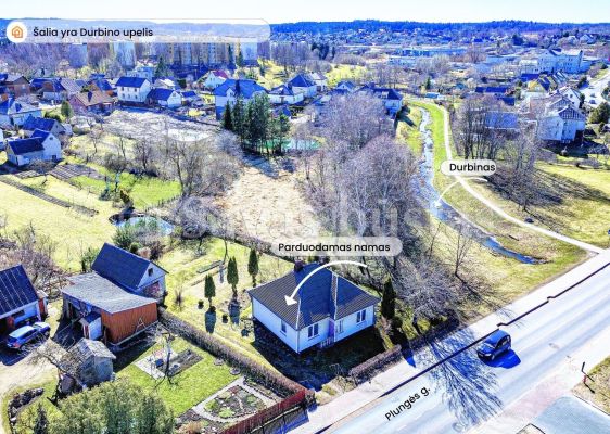 Parduodamas rąstinis namas šalia miesto centro, prie Durbino upelio, Telšiuose, Plungės g. 9. Namas yra vieno aukšto, 1952 m. statybos. Bendras namo plotas – 70,01 kv. m. Yra 3 kambariai, virtuvė, neįrengta vonios patalpa. Namo išorėje sienos apkaltos plastikinėmis lentelėmis, pakeistas namo stogas. Visame name įstatyti plastikiniai langai. Viduje buvo pradėti remonto darbai. Dalis sienų yra apšiltintos iš vidaus. Atnaujinta dalis grindų. Vonios kambaryje įvesta kanalizacija. Miesto vandentiekis yra prie sklypo ribos. Namas šildomas židiniu ir ortakiais arba kieto kuro krosnimi. Prie namo yra sandėliukas, virš kurio įrengtas balkonas-terasa.